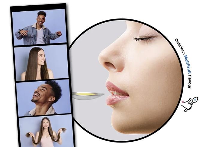 Hydrolysed Marine Collagen → source of amino acids that help support hair structure, skin elasticity, and nail strength.
